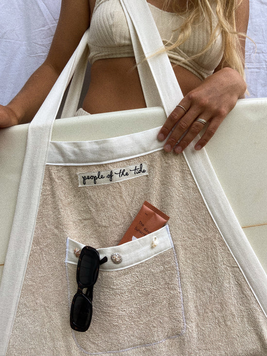 We use vintage towelling fabric that we thrift ourselves, straps on our carriers are an organic hemp and cotton blend. People of the Tide logo tags are locally embroidered in Bermagui.