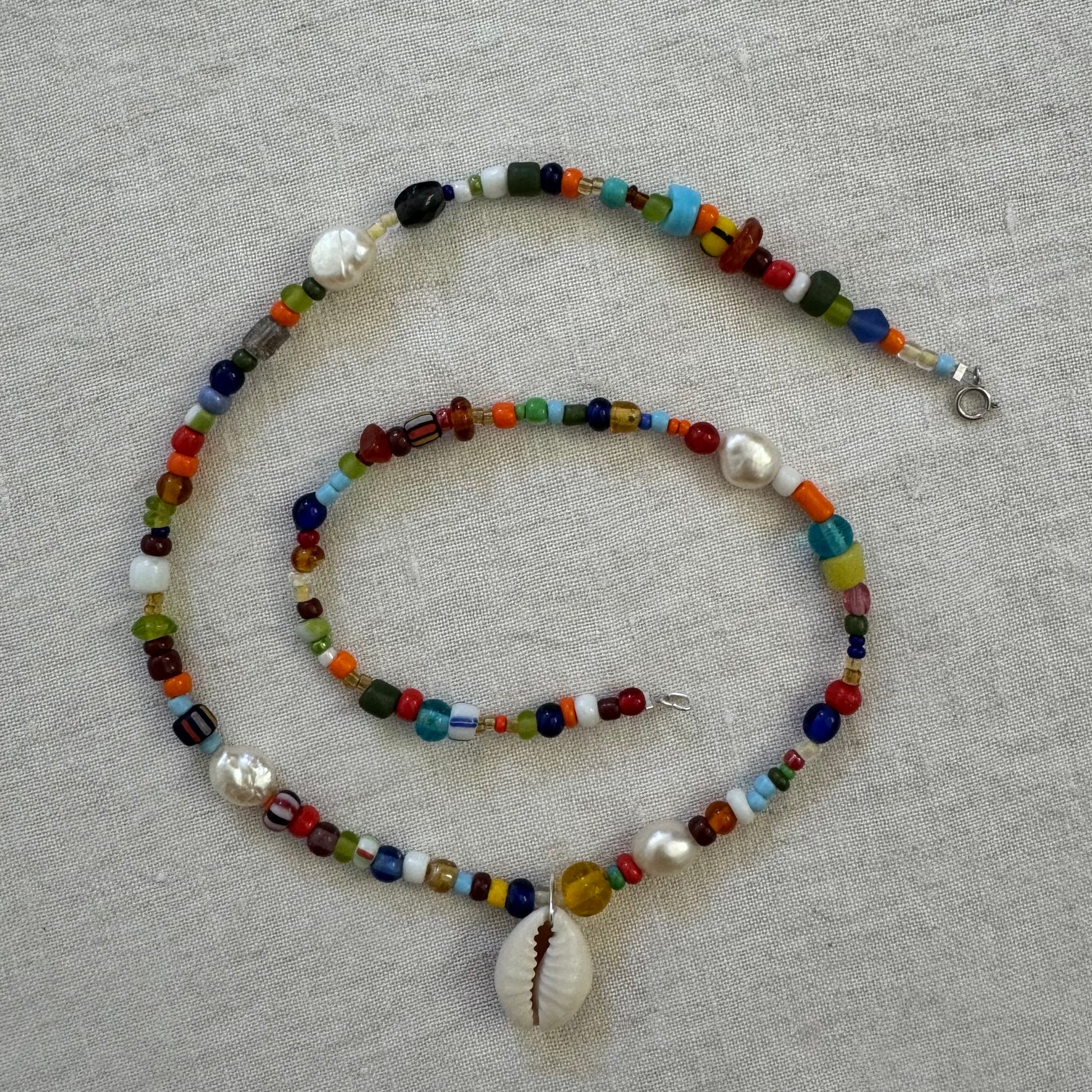 A carefully picked and handbeaded selection of treasures. All cowrie shells are thrifted and the beads & pearls we've collected over the years from op shops, markets and local bead shops. Findings are sterling silver so you don't need to take it off for ocean dips.